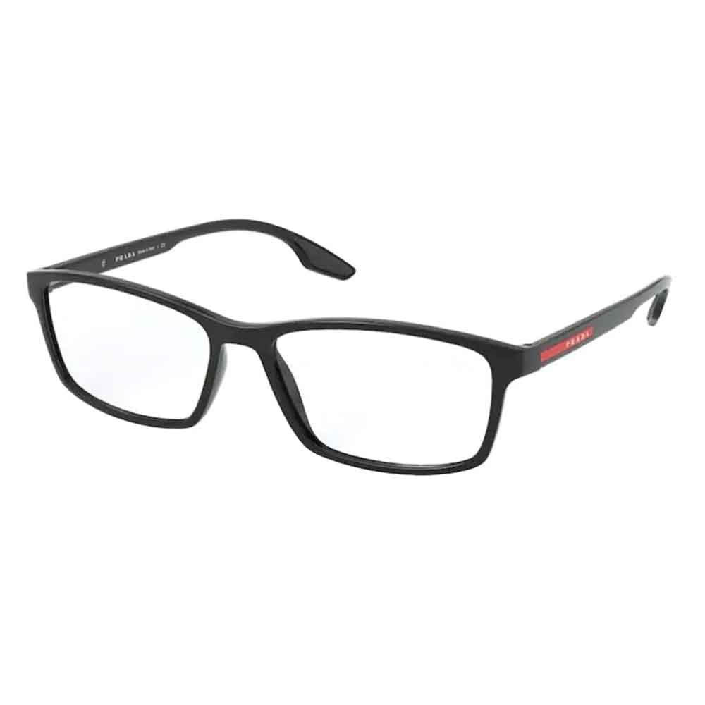 The Prada Linea Rossa 0PS 04MV glasses offer a sleek, rectangular design with durable acetate construction and the signature Prada red stripe, perfect for a stylish, everyday look.