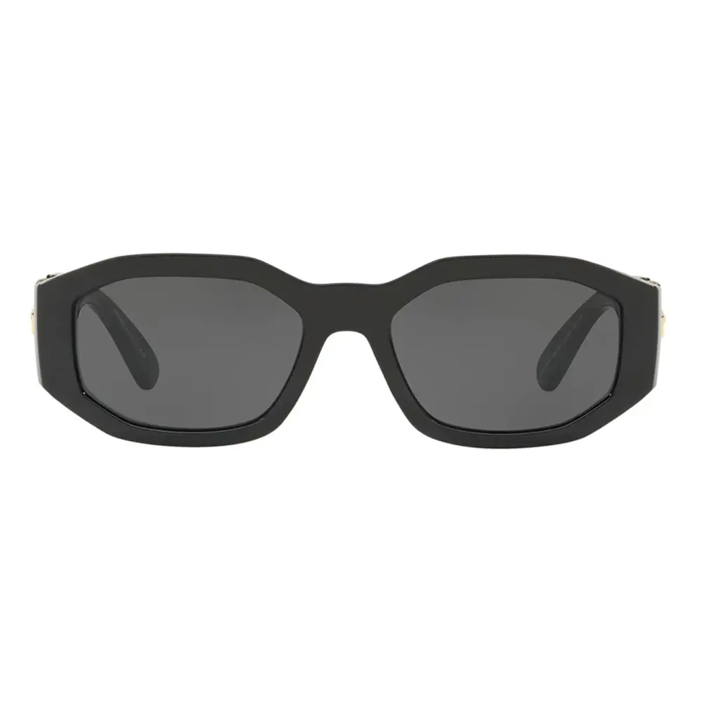 Make a bold statement with the Versace VE4361 GB1/87 Biggie sunglasses. Featuring a thick black rectangular frame with grey lenses and gold Medusa medallions, this iconic style is worn by Sabrina Carpenter and inspired by 90s hip-hop fashion. Available with prescription lenses and fast UK delivery.